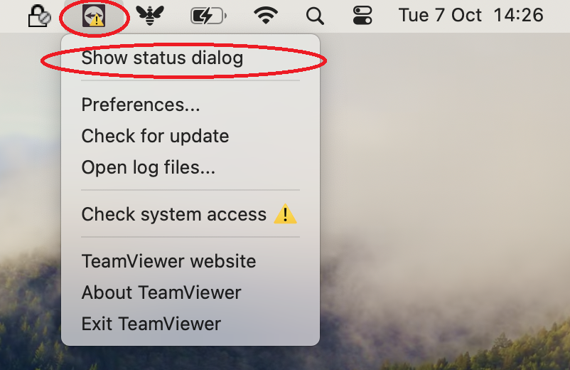 Trykk på Teamviewer ikonet øverst i menylinjen. Trykk deretter på "Show status dialog".