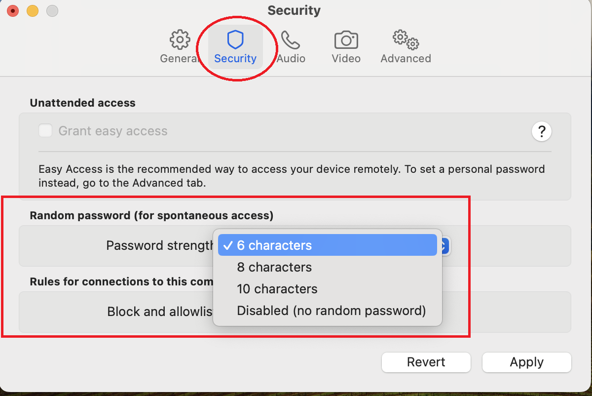 3. Hvis passordfeltet er tomt trykk på tannhjulet som er på bildet over. Velg deretter "Security" fanen og under "Random password strength" velg 6 characters. Trykk deretter på det røde krysset øverst til venstre så vil du ha både ID og passord.