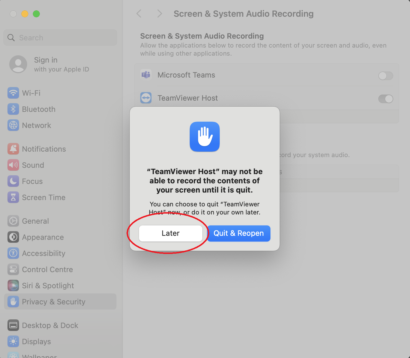 Velg later. Nå er skjermen din delt med den som fjernstyrer deg.