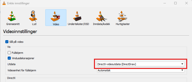 Opplever man at videoklipp hakker, så er en mulig fiks å endre utdata fra Automatisk til DirectX-videoutdata (DirectDraw)